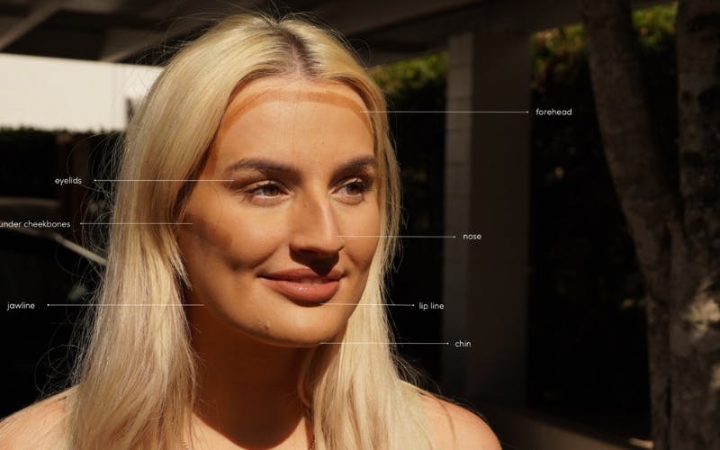 1. Use your shade of jane iredale Glow Time Bronzer Stick (shade pictured is ‘Scorch’) to map out any areas you would like to chisel. Pick from this list (pictured below) the ones your heart desires: forehead, chin, cheeks, nose, lips and jawline. Switch it up by alternating which features you choose to contour depending on how you feel and the vibe you’re going for.